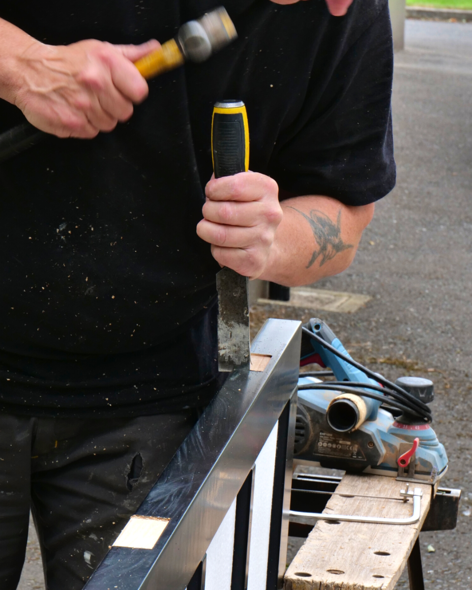 Step 6: Chisel around the outline of the hinge – the tools you’ll need to do this is a drill, drill bits, chisel, hammer and screwdriver.