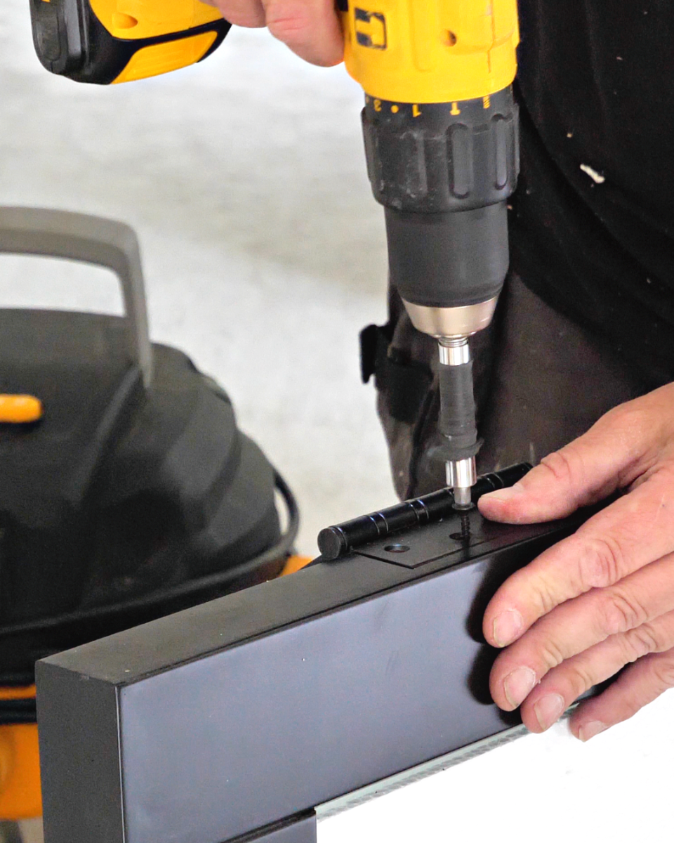 Mark the holes after grabbing the hinges. Once the holes have been marked, drill the pilot holes, and attach all of the hinges to the door.