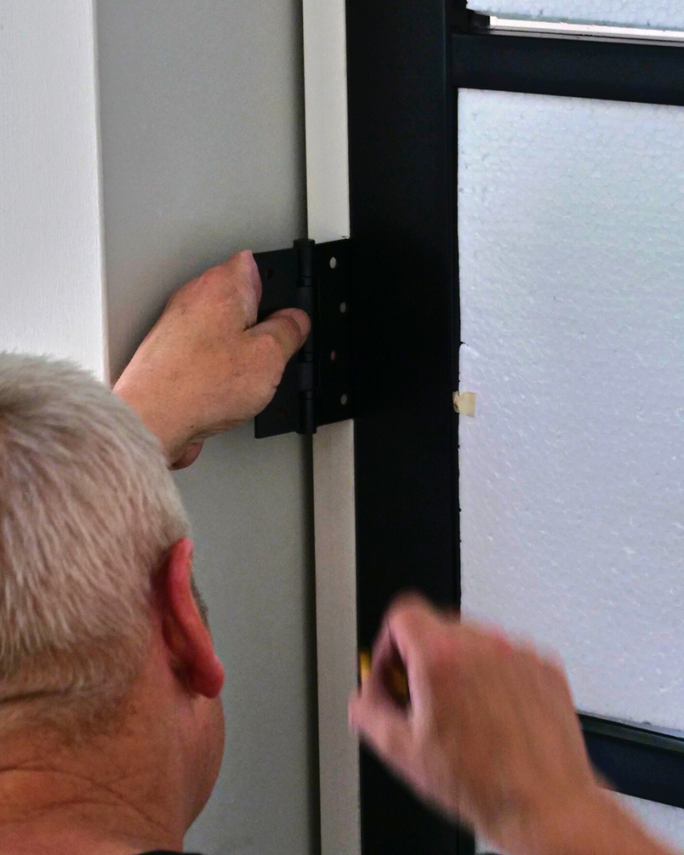 Step 7: While holding the door to the doorframe using the wedge supports or with assistance (if you have a helping hand) screw the middle bolt into each hinge.